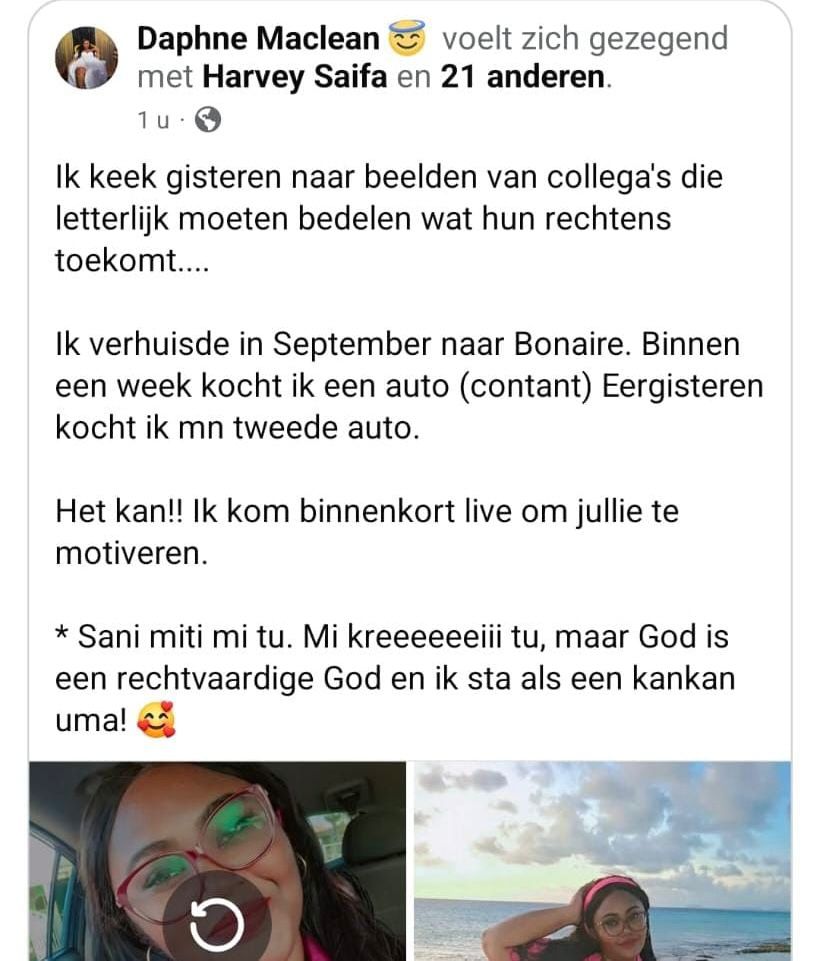 Terwijl ze onlangs beelden zag van collega’s die volgens haar “letterlijk moeten bedelen voor wat hun rechtens toekomt”, schetst Maclean een heel ander verhaal over haar eigen realiteit. In september verhuisde ze naar Bonaire en binnen één week kocht ze daar haar eerste auto – contant. Eergisteren volgde auto nummer twee. Ook die werd zonder lening aangeschaft.
